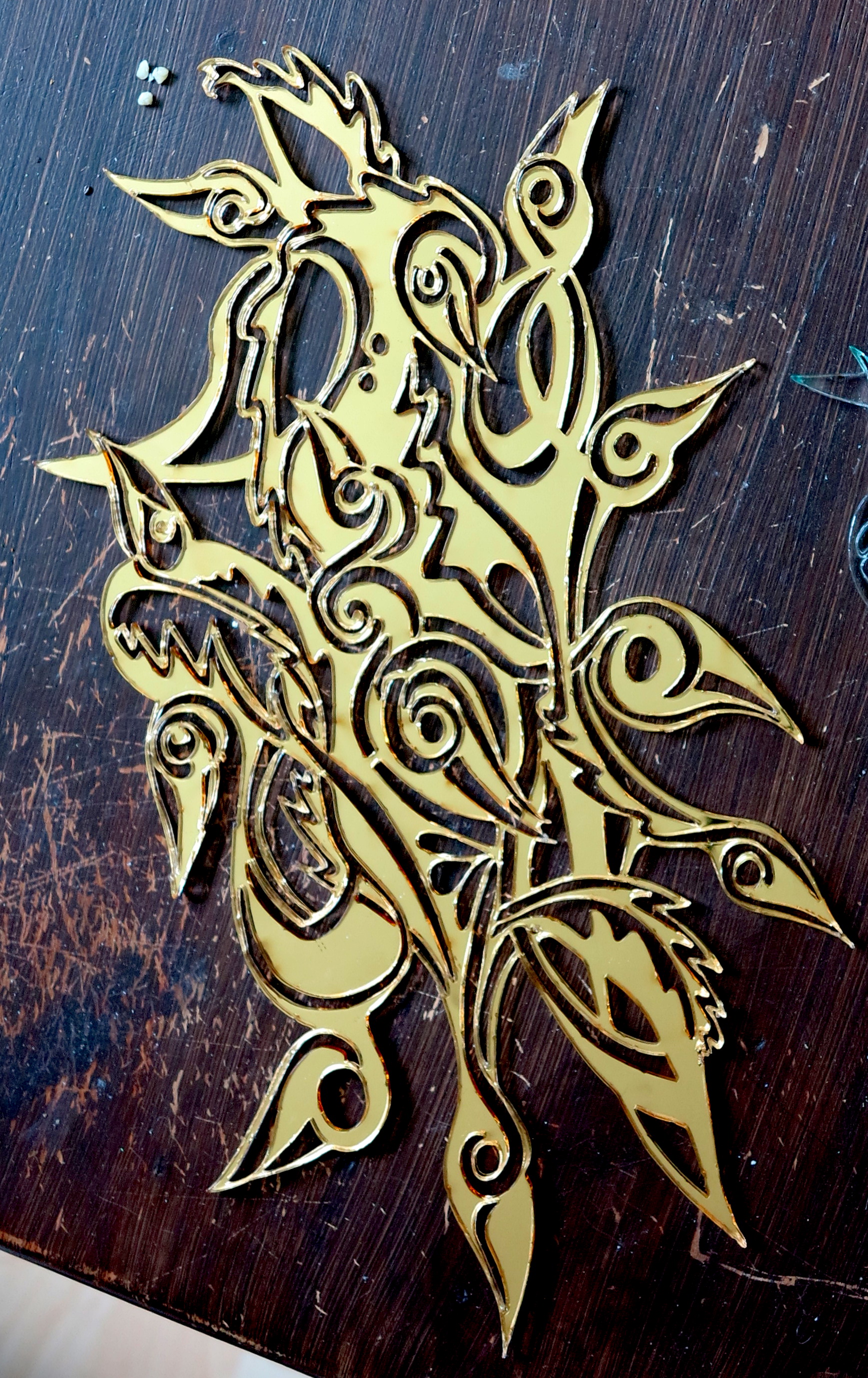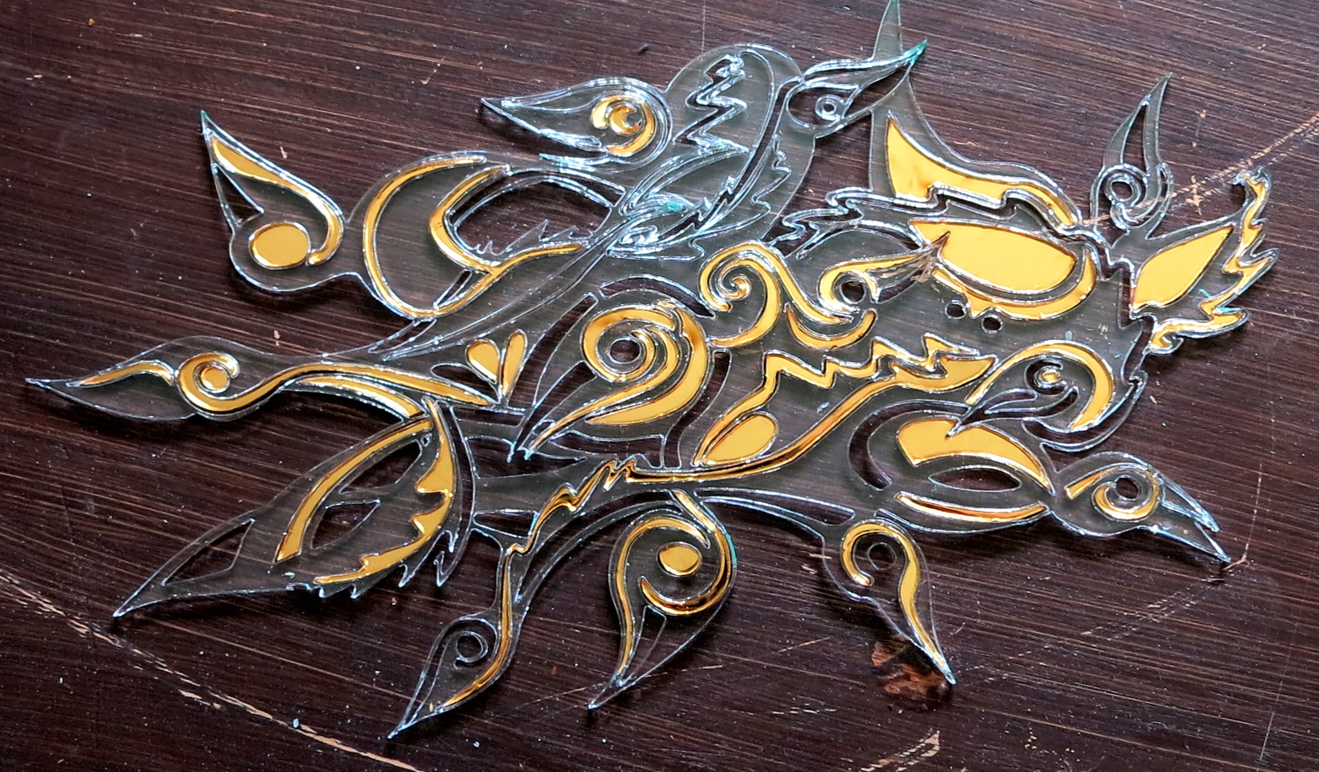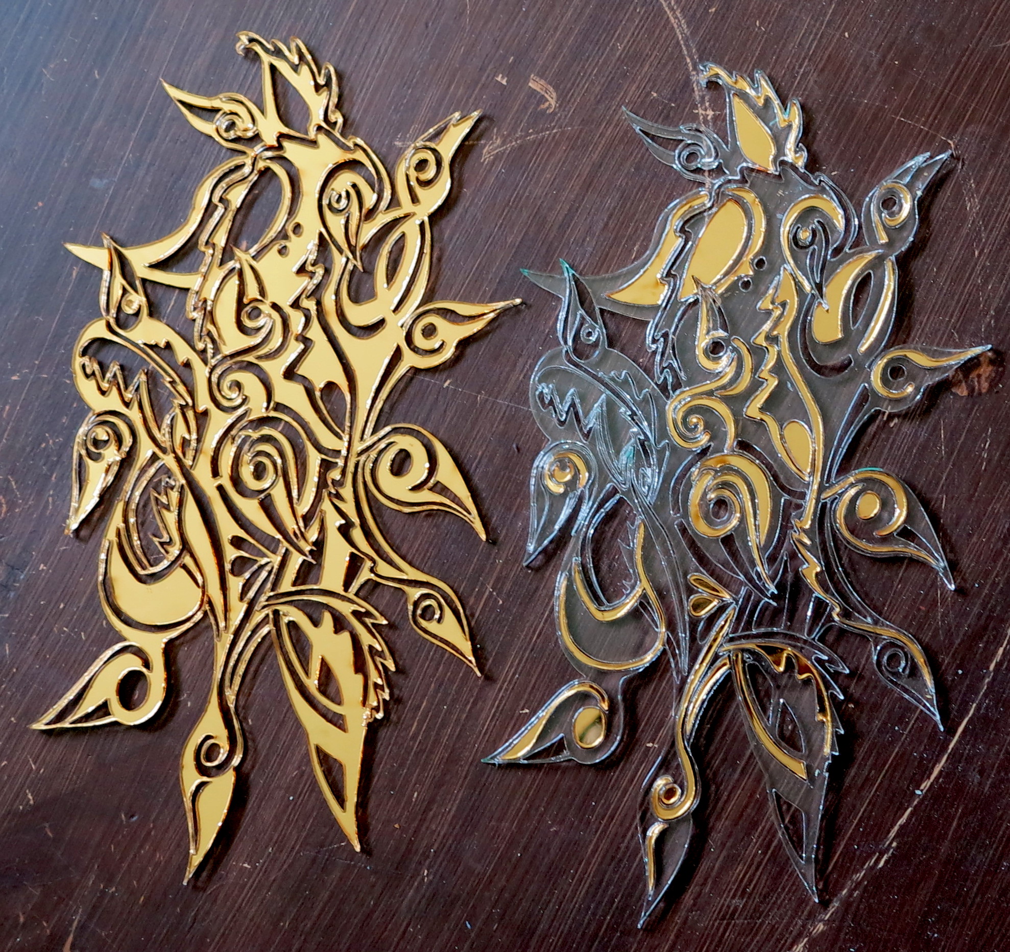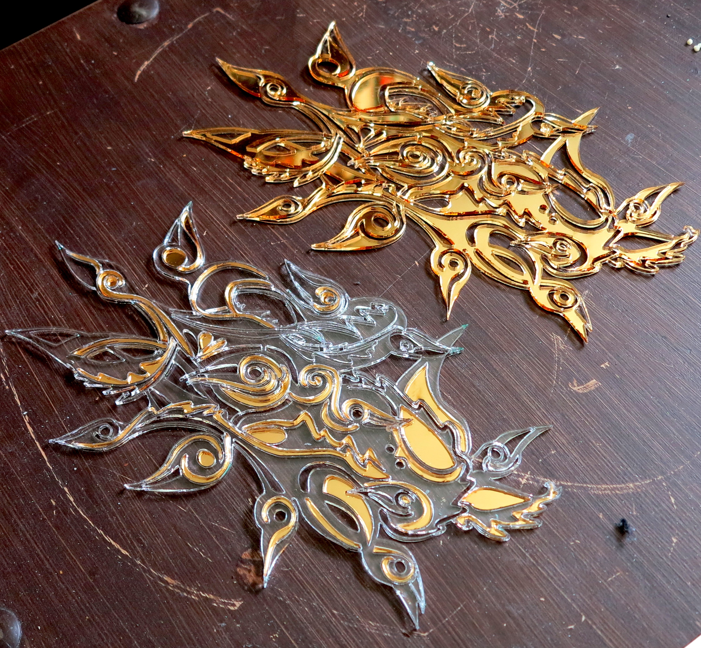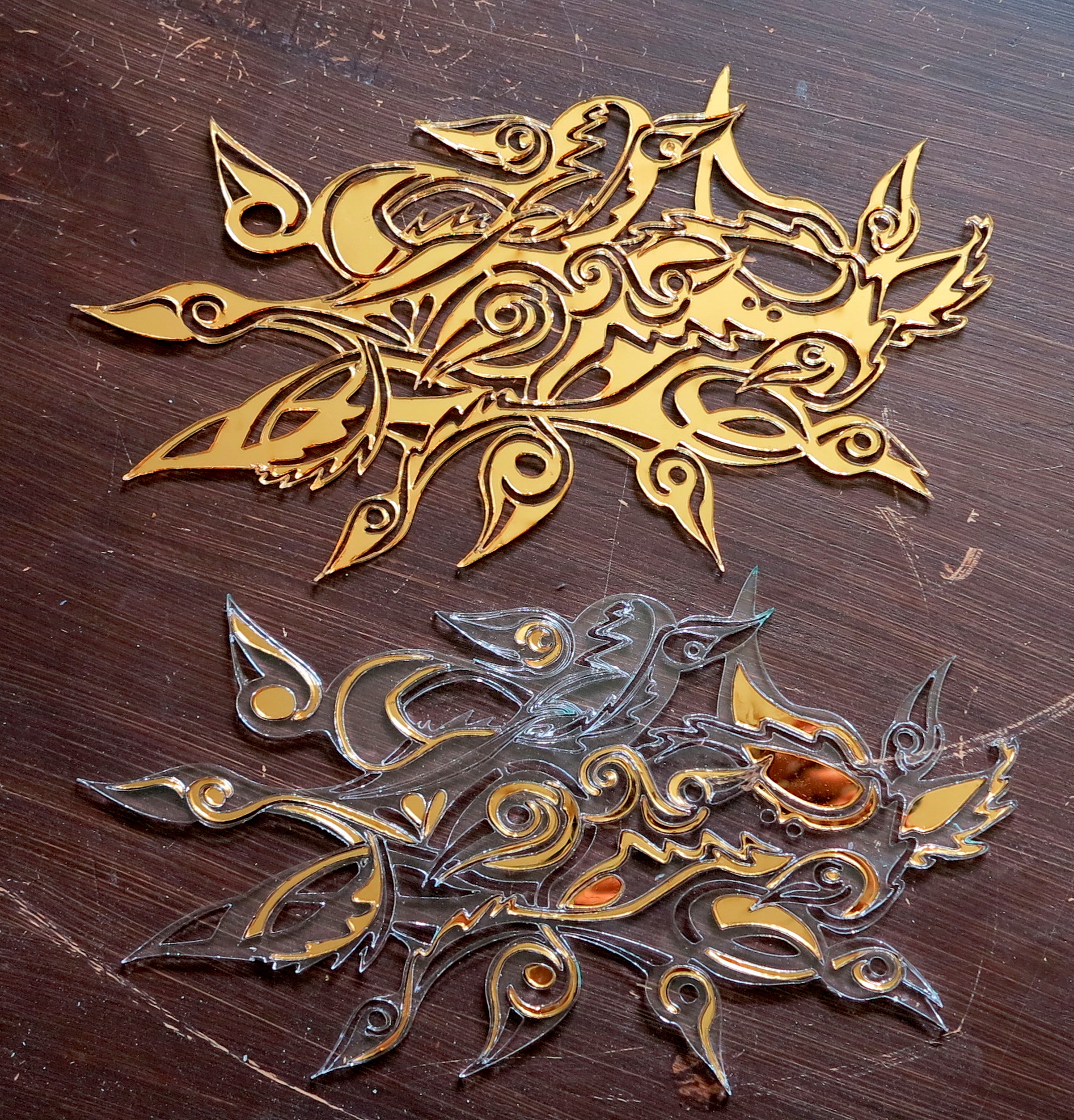 The doodle has been sitting in my sketchbook for a long time… and readers now know I have access to, and obsession about, the laser cutter at uni. So long story short, I got hold of some transparent, and some gold mirror plexiglas. The idea was; cutting the same shape out of both materials, I could create inlay, of gold in transparent, and transparent in gold. I have not found much of laser-cut inlay out on the webs and was not sure if it was going to work, because: