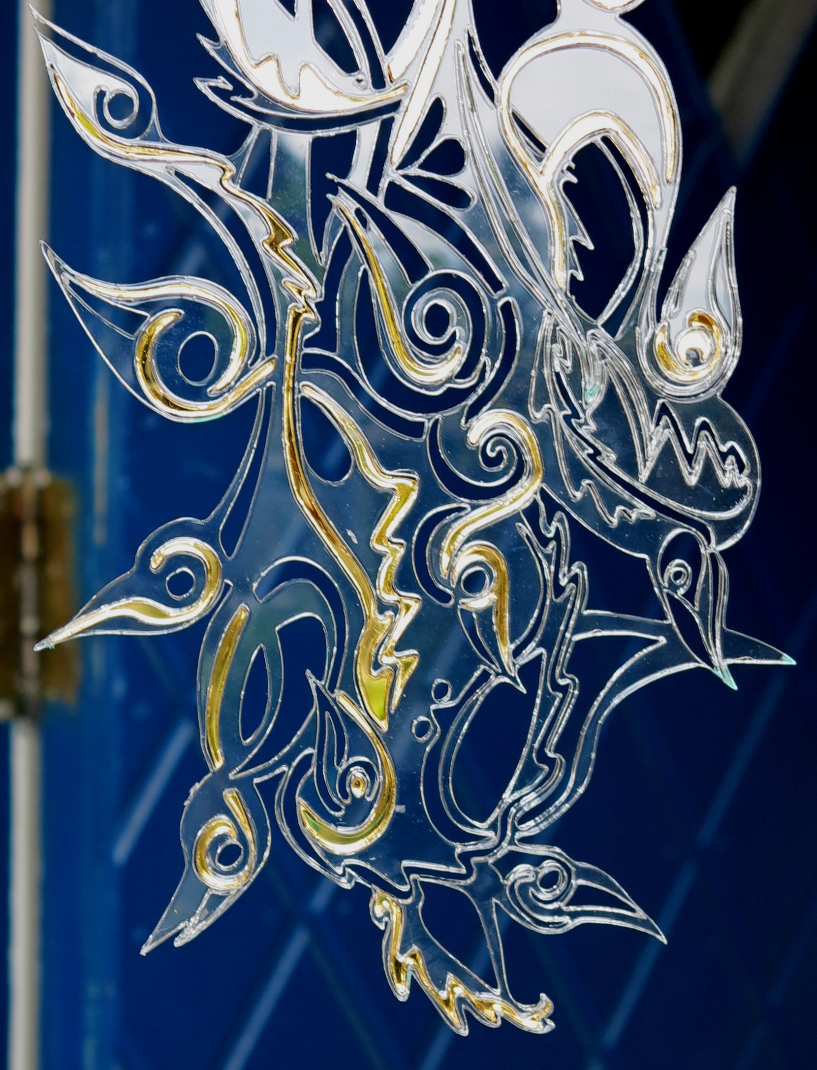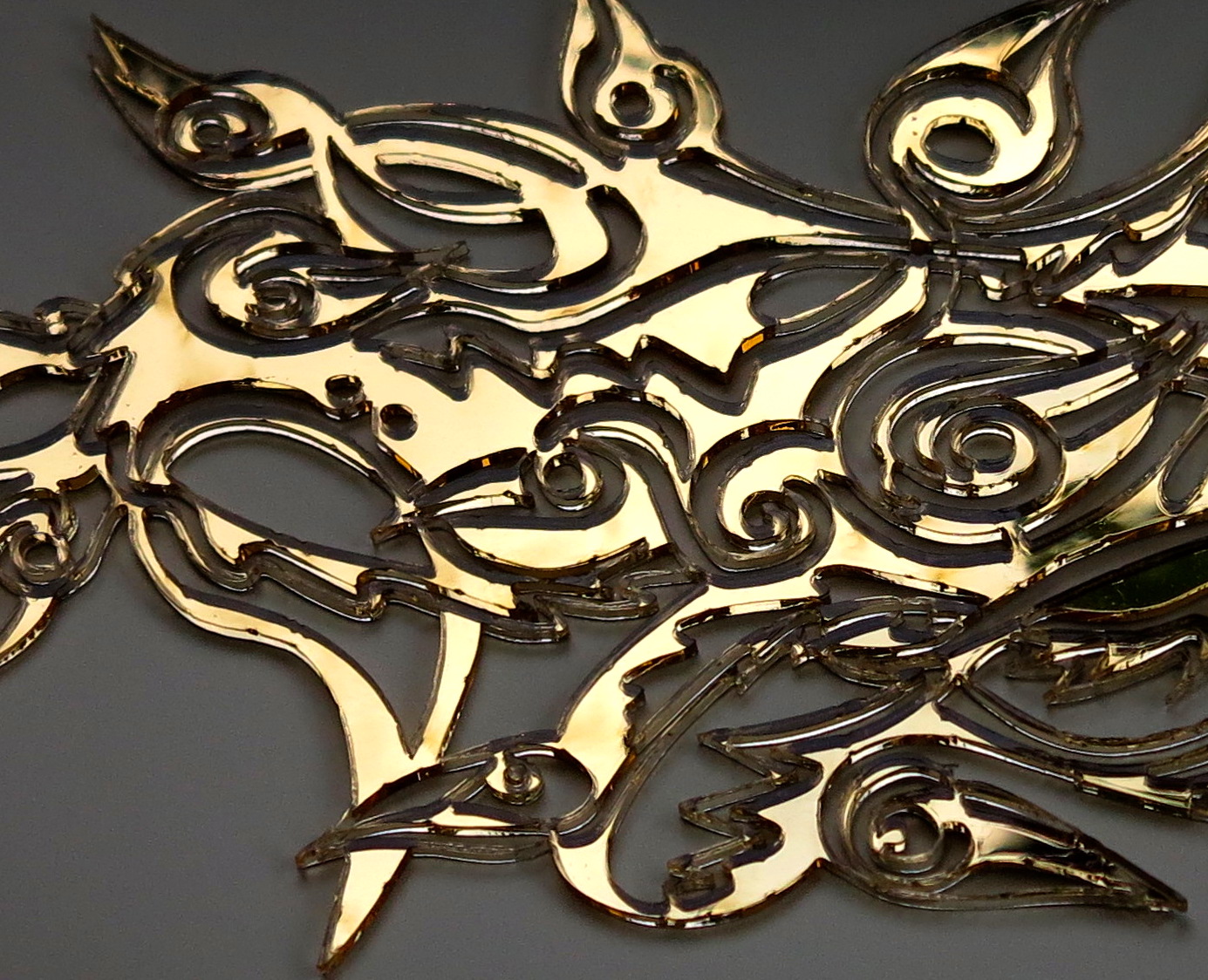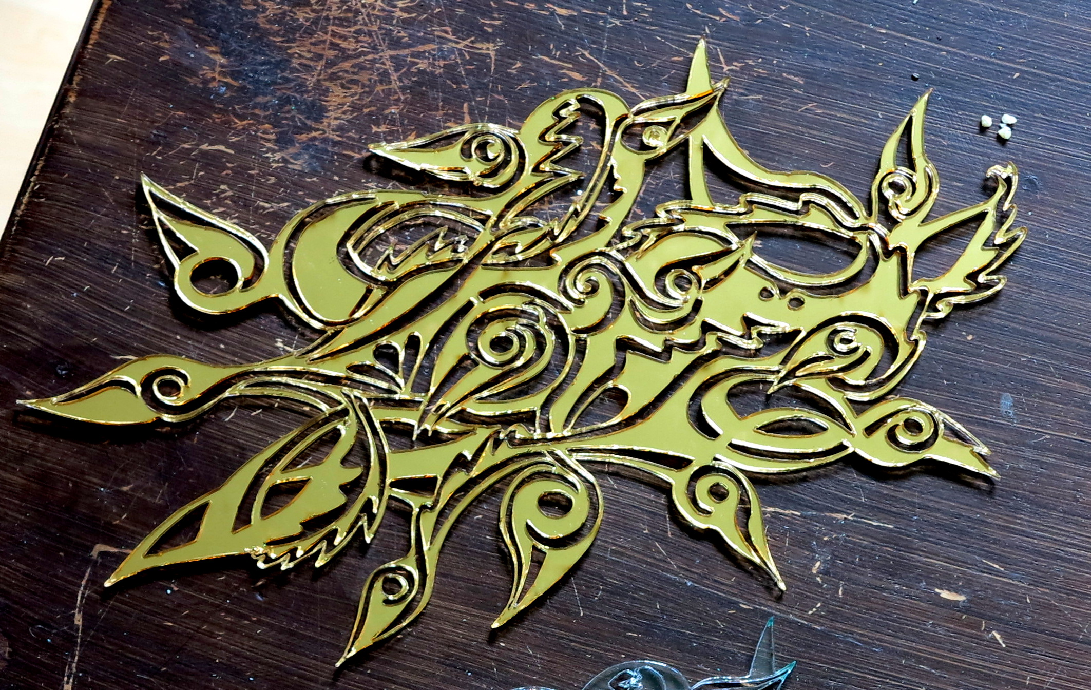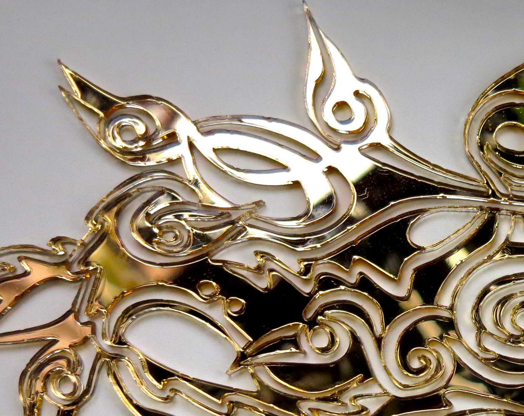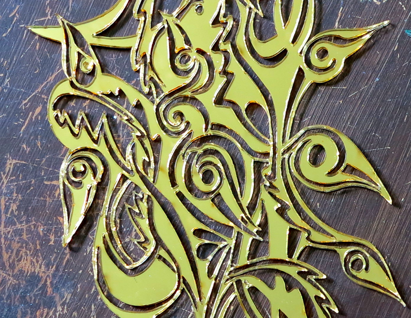 The doodle has been sitting in my sketchbook for a long time… and readers now know I have access to, and obsession about, the laser cutter at uni. So long story short, I got hold of some transparent, and some gold mirror plexiglas. The idea was; cutting the same shape out of both materials, I could create inlay, of gold in transparent, and transparent in gold. I have not found much of laser-cut inlay out on the webs and was not sure if it was going to work, because:
