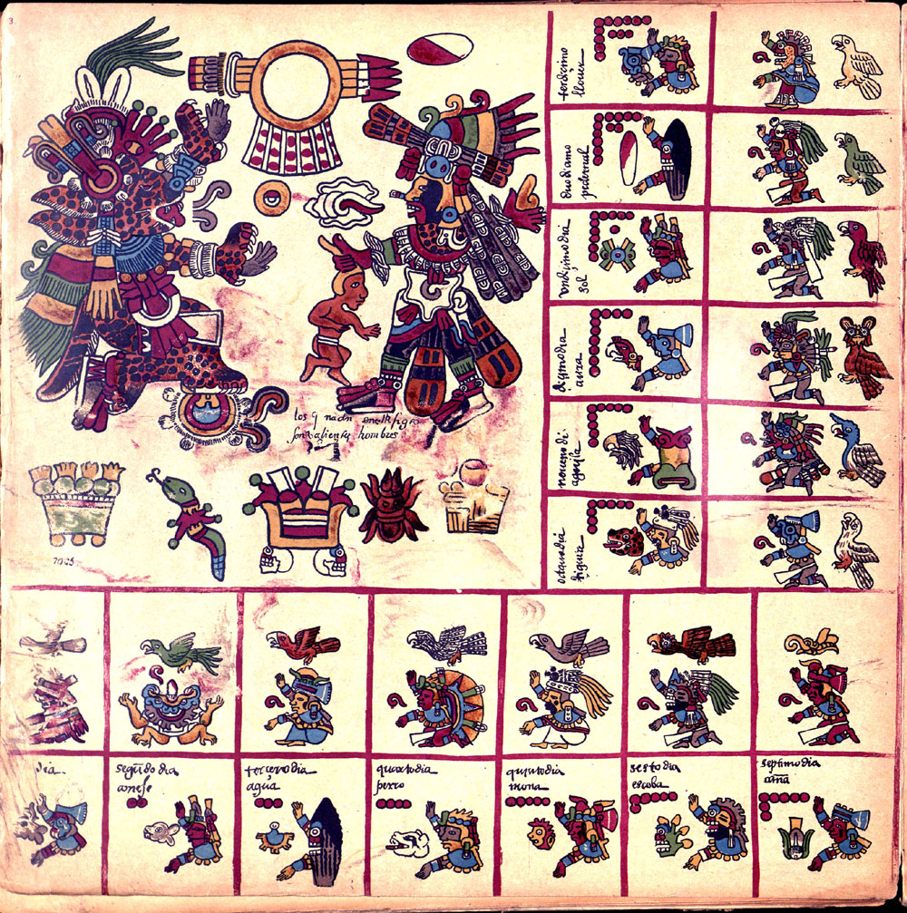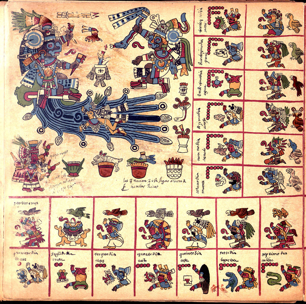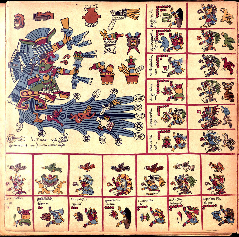 Its first section is an intricate divinatory calendar, one of the few surviving. Each page represents one of the 20 trecena or 13-day periods, in the 260-day year. The pages are covered in paintings of the ruling deity or deities surrounded by the 13 day-signs and 13 other glyphs and deities. The collection of symbols, 26 of them, were used by the priests to create horoscopes and divine the future. The second section documents the Mesoamerican 52-year cycle, correlating the order of the dates of the first days of each solar year with the nine Lords of the Night; and the third section focuses on rituals and ceremonies, especially for the last days of the 52-year cycle.