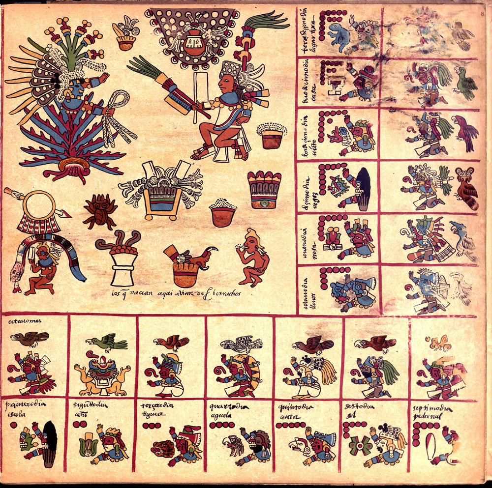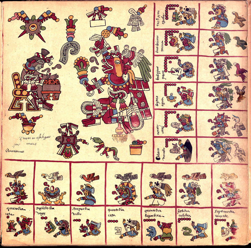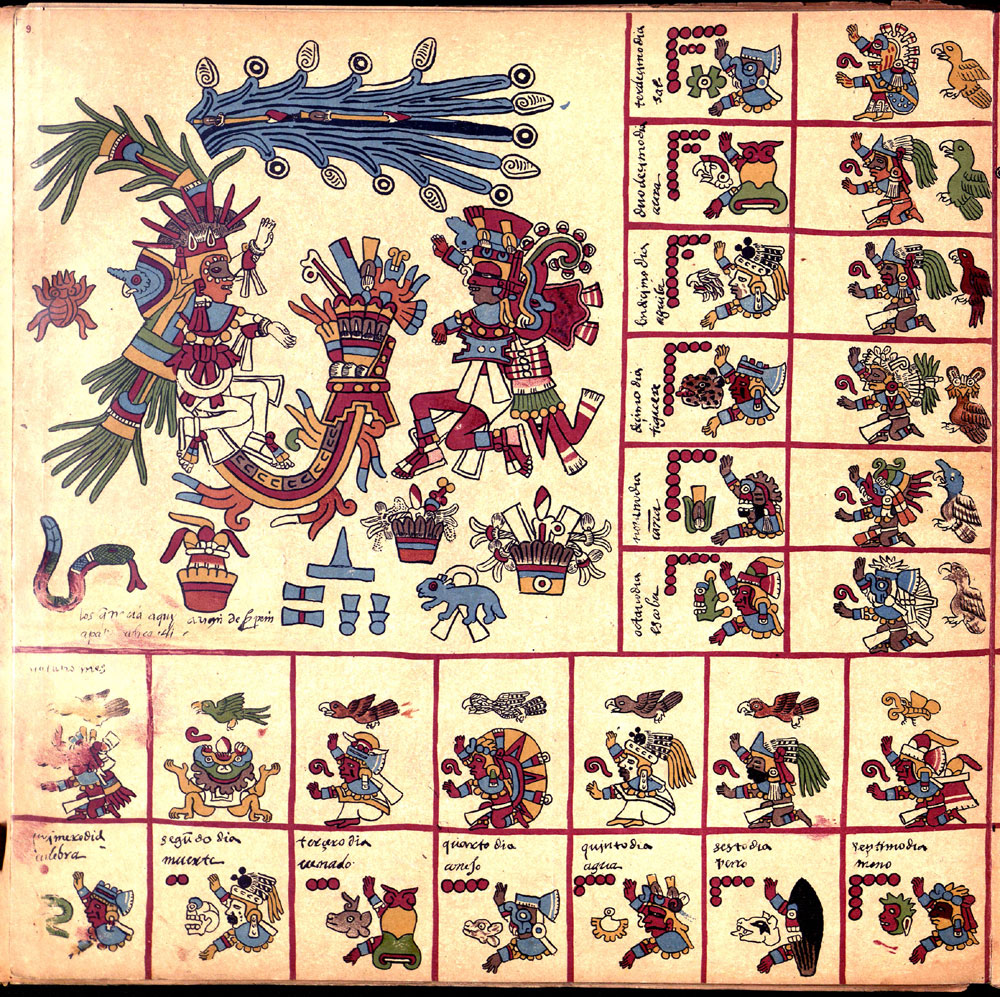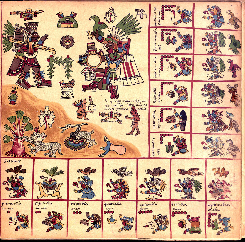 Its first section is an intricate divinatory calendar, one of the few surviving. Each page represents one of the 20 trecena or 13-day periods, in the 260-day year. The pages are covered in paintings of the ruling deity or deities surrounded by the 13 day-signs and 13 other glyphs and deities. The collection of symbols, 26 of them, were used by the priests to create horoscopes and divine the future. The second section documents the Mesoamerican 52-year cycle, correlating the order of the dates of the first days of each solar year with the nine Lords of the Night; and the third section focuses on rituals and ceremonies, especially for the last days of the 52-year cycle.