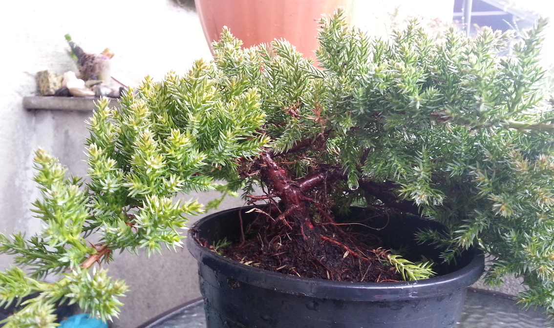 There are millions of “good advice” out there, and I read a shitload of it. There is this idea that if you remove x % of roots, you should remove about the same of foliage and vice versa. On one level this makes sense; the roots have to feed the foliage, the foliage needs to photosynthesis properly etc. I kinda felt sorry for the little thing. I cut about … 1/4th of the roots, and perhaps – so far – 1/5 of the foliage. Now; it needs to just sit there. If I can keep my grubby mitts off it, I will not touch it until I am seeing new growth, to ensure it is settling (or at least, be sure that it is not miserably dying). In the meantime, I will be staring at pictures, and how the pros snip foliage. Then, when some new shoots appear, I will wire it… that might well kill it off completely.