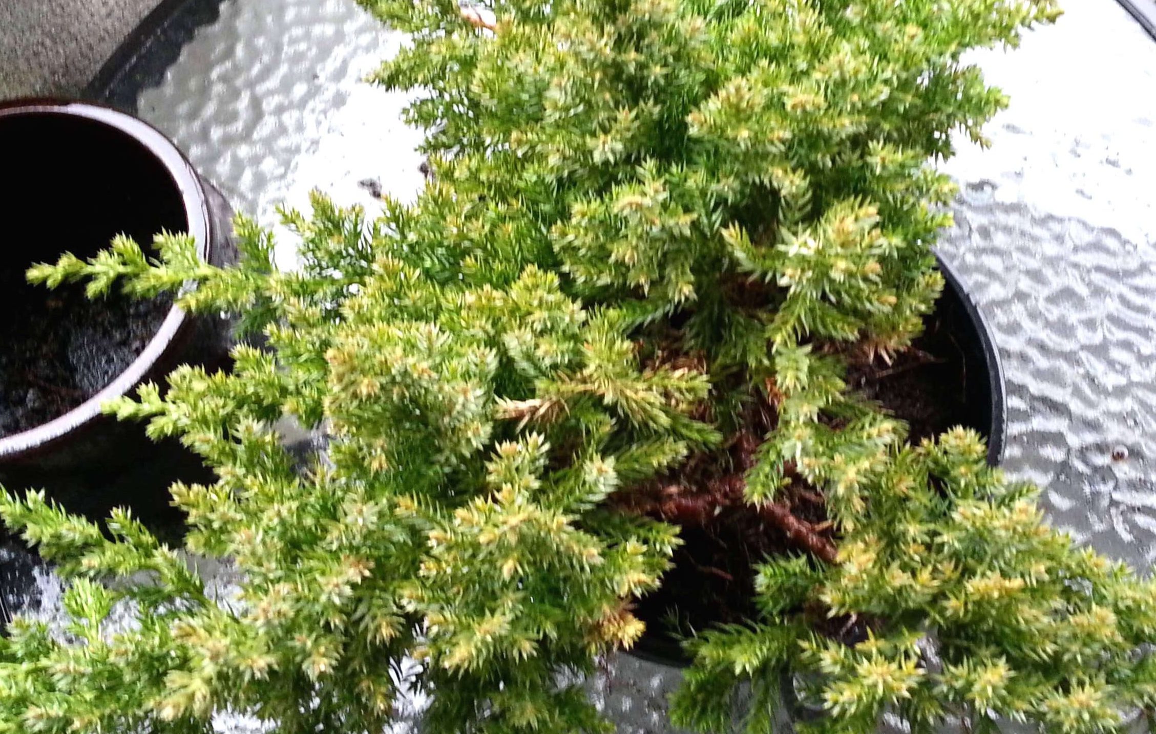 So. I went to the garden centre and got a juniper, Juniperus procumbens ‘Nana’, which is the one suggested for absolute noobs. I have no real idea what to look for, and it is dense, prickly; the branches stiff; so looking underneath it is a hassle. The weather was freezing and awful, so I was not going to stand there for ages, looking.
