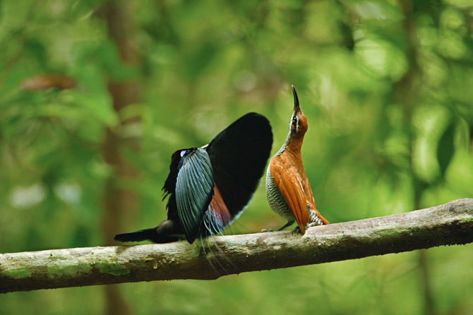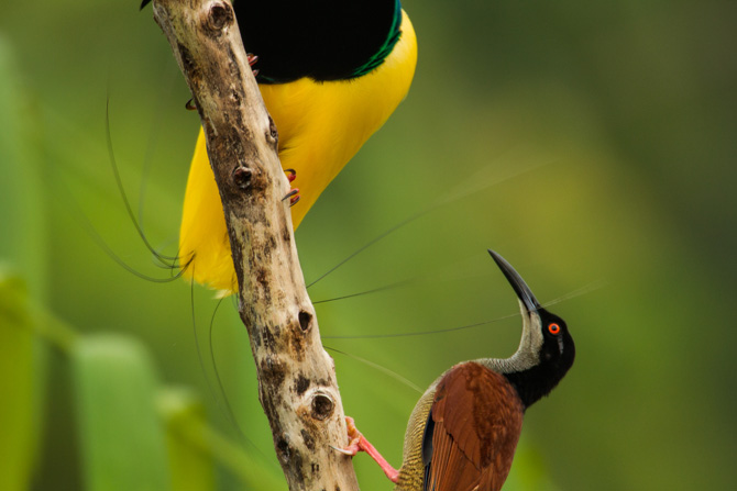 The majority of birds of paradise are sexual dimorphic and polygamous (males with the spectacular plumage that has come to typify the Paradisaeidae family, and females with a more conservative look of lackluster grays and browns). But not all of them look as surprisingly different, and those that don’t tend to be monogamous. Apparently, their diets are not as rich as those of the colourful species, so male and female must both help finding food. This leaves no time for complex courtships.
