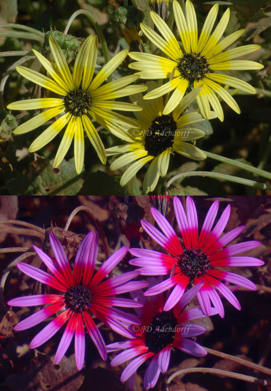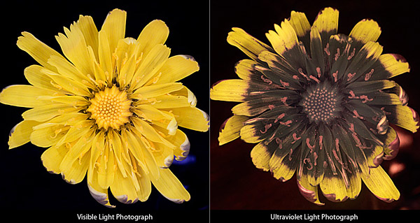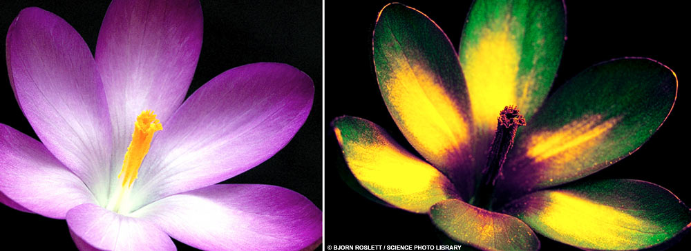 Bees, for example, can detect ultraviolet light. If a plan depends on insect pollination, it is definitely advantageous for it to also have ultraviolet “colors” and patterns that can help bees and other nectar searching insects identify them. Birds can also see ultra-violet, and some feathers have markings we cannot se. There is, however, a downside to being sensitive to ultraviolet: sensibility to red decreases too (red is on the other end of the spectrum and all animals have a limited range – regardless of whether it matches ours or is displaced compared to it).
